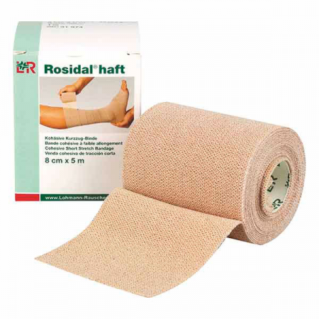 Cohesieve korterekzwachtel voor de behandeling van vaatziekten, zoals flebologische of lymfatische aandoeningen. 99 % katoen, 1 % synthetisch garen
